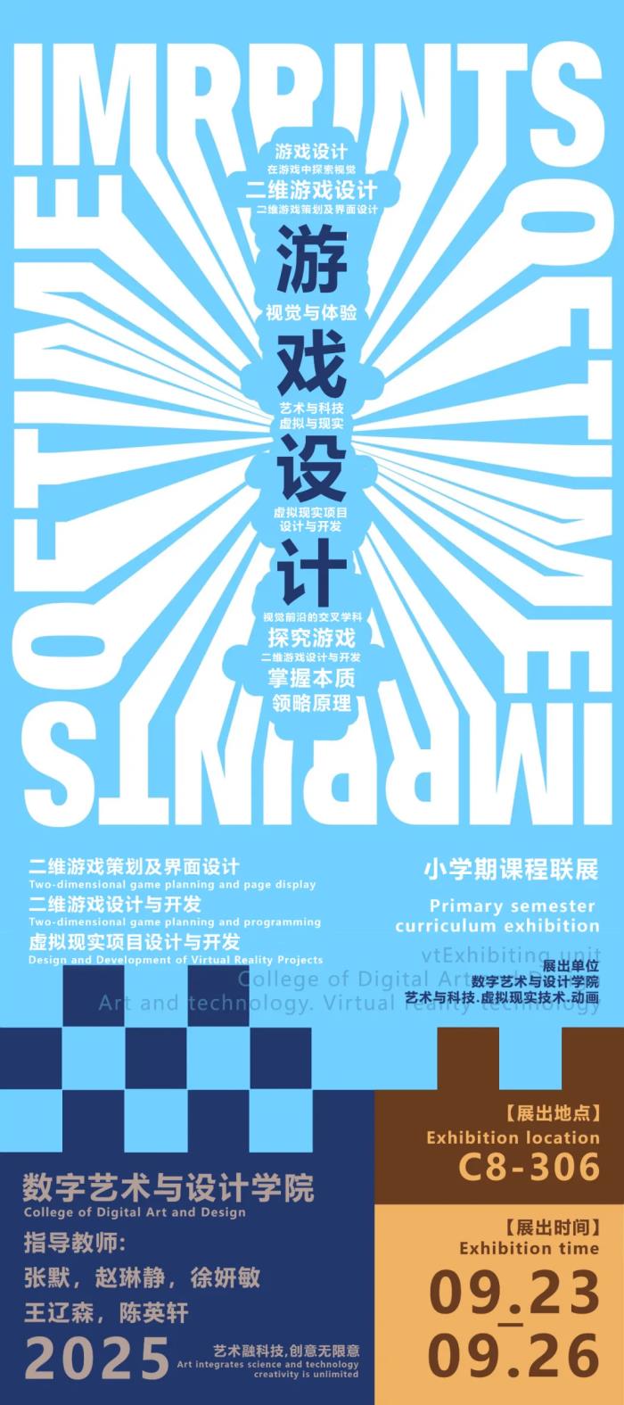 9月23日至26日,数字艺术与设计学院艺术与科技系艺术与科技专业与虚拟现实技术专业于C8-301举行了大一与大二年级的小学期课程联展。”二维游戏设计与开发“项目面向艺术与科技大二年级、虚拟现实技术大一年级、动画等专业学生,项目以二维游戏开发为核心,衔接前后课程,培养学生的逻辑思维与协作能力、激发创新精神,为学生未来深耕游戏策划、美术设计、技术开发等相关领域积累核心实践经验,实现知识、能力、素质的全面发展。”虚拟现实项目设计与开发“则主要面对虚拟现实技术大二年级学生,以VR项目开发为核心,提高学生们的策划能力、统筹能力、软件应用能力、知识转化能力等综合素质,为学生未来钻研VR项目,进一步明确自己未来的学习方向提供了一个平台。