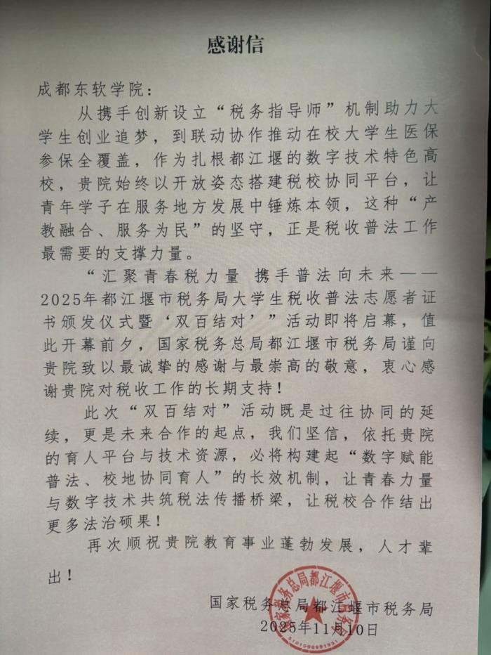 此次“双百结对”活动既是过往协同的延续,更是未来合作的起点。站在新的历史节点,成都东软学院与都江堰市税务局将进一步深化合作,依托学校的育人平台与技术资源,构建起“数字赋能普法、校地协同育人”的长效机制。 未来,双方将重点推进三方面工作:一是丰富税收普法内容供给,结合不同专业学生的特点,开发更多针对性强、形式新颖的普法课程和实践项目,让税收知识与专业学习深度融合;二是创新普法传播形式,充分发挥成都东软学院的数字技术优势,打造税收普法短视频、互动小程序、虚拟仿真办税体验等数字化产品,让税收普法更具吸引力和传播力;三是完善协同育人机制,优化“税务指导师”制度,扩大“双百结对”覆盖面,让更多学生有机会参与税收实践,在服务社会中锤炼本领、增长才干。 此次“2025年大学生税收普法志愿者证书颁发仪式暨‘双百结对’活动”的成功举办,标志着双方的合作进入了更深入、更广阔的新阶段。 未来,成都东软学院将继续秉持“产教融合、服务为民”的理念,与都江堰市税务局携手同行,让税收法治精神融入更多学生的成长历程,培养出更多兼具专业能力与法治素养的优秀人才。我们相信,在青春力量的助力下,在数字技术的赋能下,税收普法工作必将焕发更强生机与活力,为税收法治建设与教育事业发展贡献更大力量!让我们以青春之名,赴法治之约,在税收普法的道路上坚定前行,共同书写校地协同育人的精彩篇章!