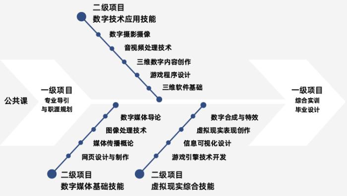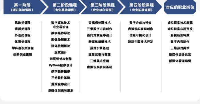 以行业需求为导向,以学生发展需求为出发点,培养学生熟练应用现代数字技术的能力。构建“项目驱动式”教学模式,实现技术手段与艺术思维相融合。专业主干课程包括:数字媒体导论、数字图像处理技术、三维软件基础、音视频处理技术、新媒体编辑技术、三维数字内容创作、媒体营销与管理、面向对象程序设计、虚拟现实表现基础、虚拟现实技术应用、数据可视化设计、数字合成与特效、游戏引擎技术开发、数字媒体技术综合实训。