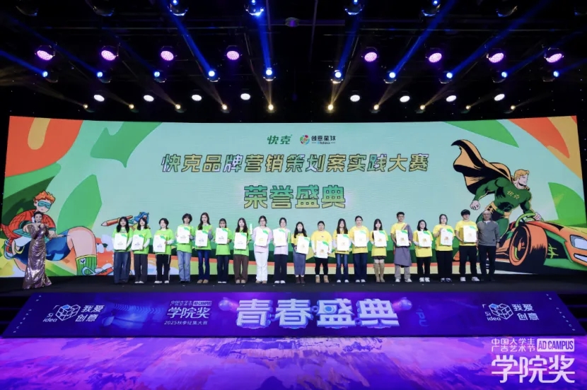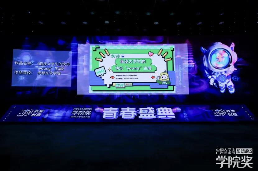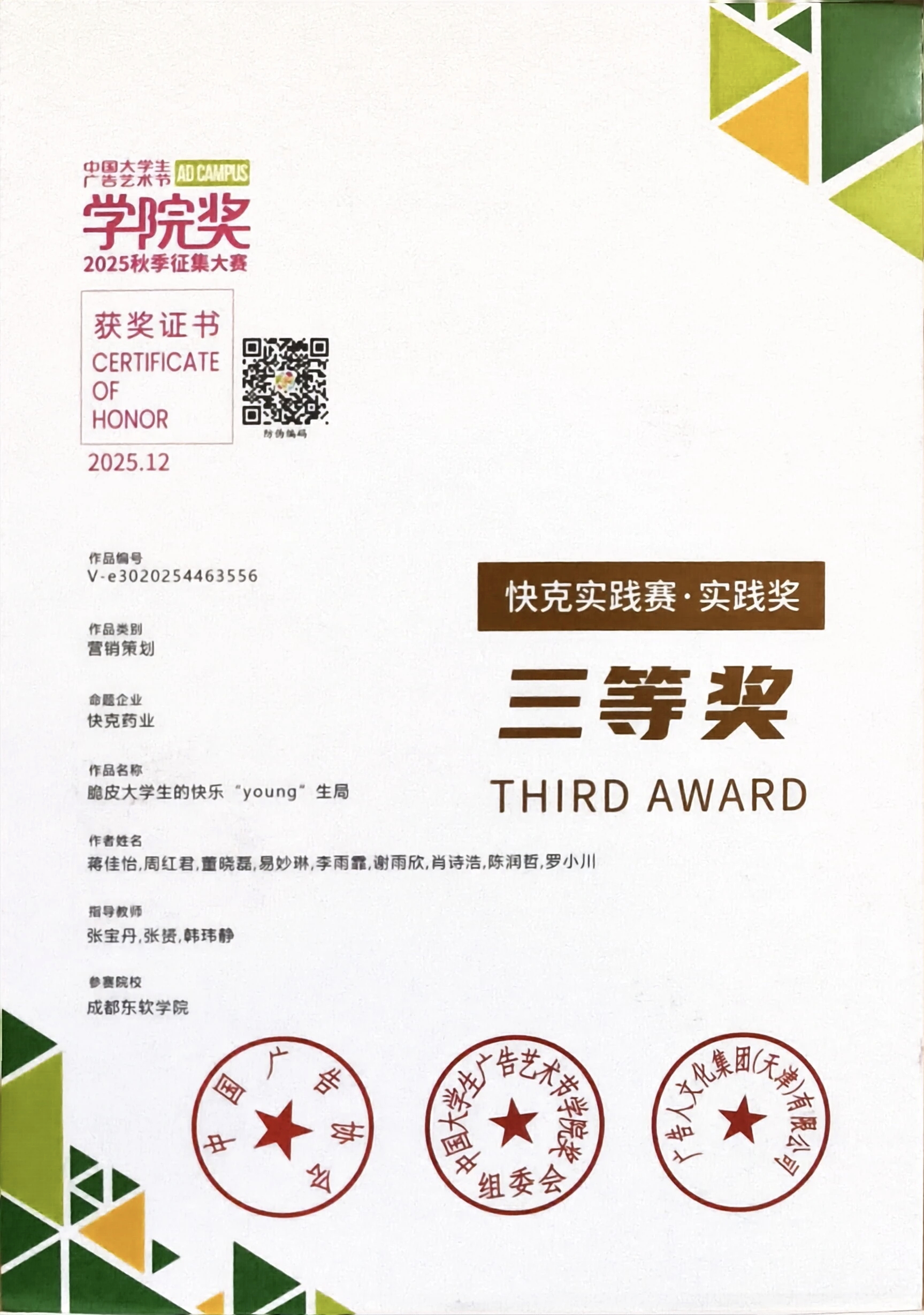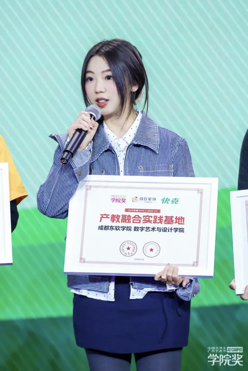 在本次大赛中,经过激烈角逐,由数字媒体技术系学生组成的代表队,其作品《脆皮大学生的快乐“young”生局》从全国众多优秀方案中脱颖而出,最终斩获全国三等奖。更为重要的是,基于我院在应用型人才培养与产业实践方面的突出成果,大赛组委会与快克品牌共同授予成都东软学院数字艺术与设计学院“产教融合实践基地”称号,并于典礼现场正式挂牌。