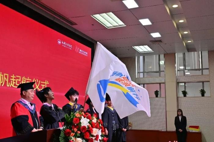 院长在讲话结束后,和现场不同专业的学生一起进行了授旗仪式,随着专业学生们一声声自发的口号喊起,大会的氛围达到了高潮!