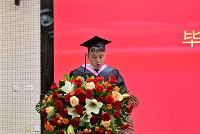 毕业生代表动画20206汪朝阳同学上台发言,他在发言中历数四年学习场景,回忆了自己在学院度过的美好时光,复盘了自己利用成都东软学院产教融合、创新创业和国际化的特色教育资源,坚持跨学科融合,不断学习成长的经历,对学校、学院老师们的悉心栽培表示感谢,同时表达了对未来的无限憧憬和坚定信念。