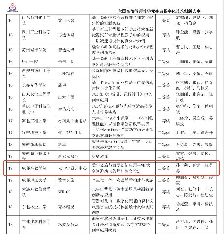 近日,2025年第6届全国高校教师教学元宇宙数字化技术创新大赛总决赛圆满落幕。成都东软学院元宇宙研究中心孙一萌、孙源、张苳荟三位教师组成的团队,凭借作品《数字文旅与教学创新应用—VR大空间游戏〈药师〉概念设定》脱颖而出,荣获全国二等奖,彰显了学校在数智技术与教育教学融合领域的创新实力。