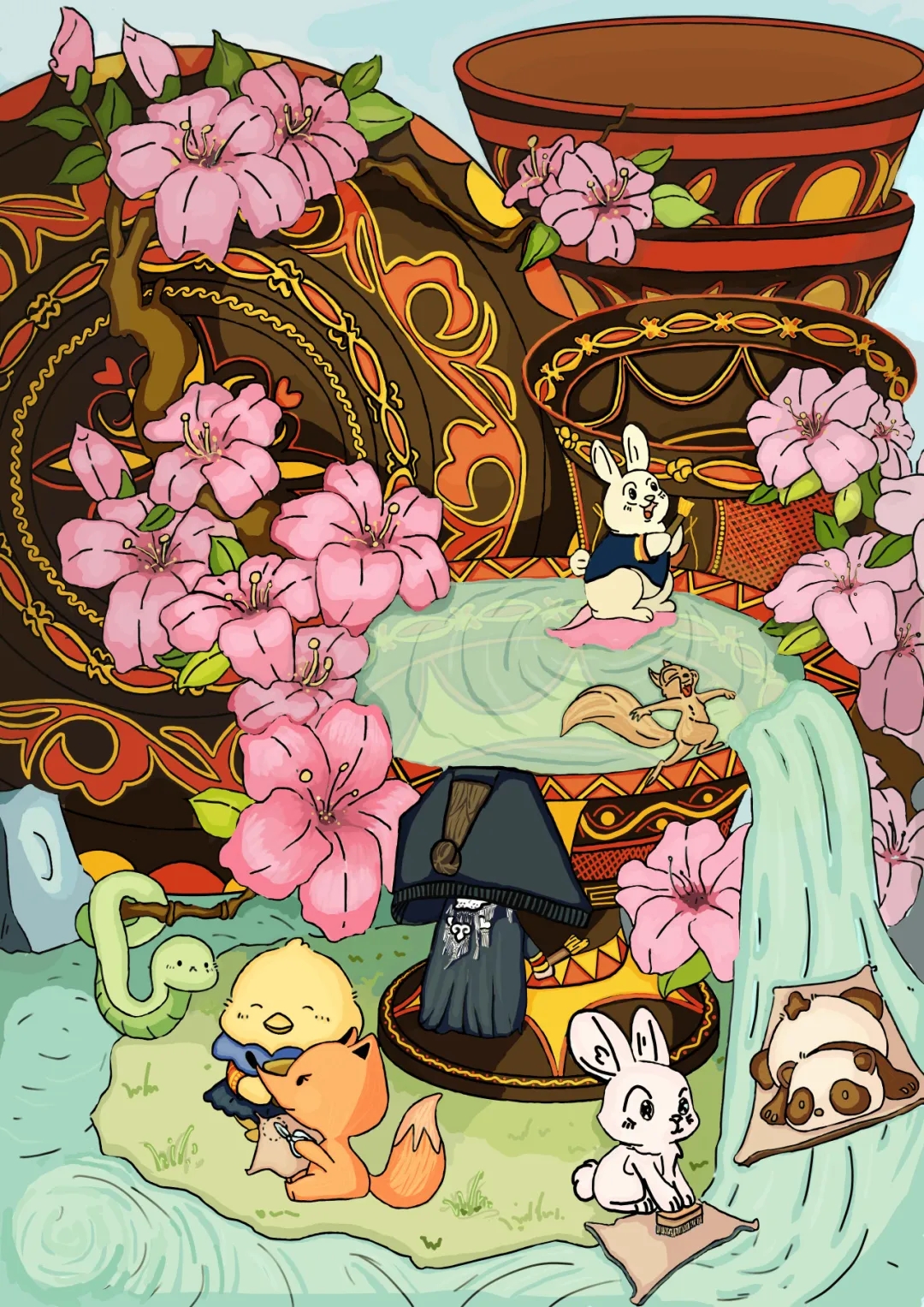 本作品以彝族漆器的视觉语言为核心载体,融合奇幻的自然意象,诠释人与自然和谐共生的深层内涵。画面中提取彝族漆器标志性的红、黑、黄三色基调与卷草纹、几何纹等传统纹样,将漆器的器型轮廓与花卉、流水、萌兽等自然元素交织重构,让彝族传统工艺的肌理与自然生态的鲜活形态相互渗透。