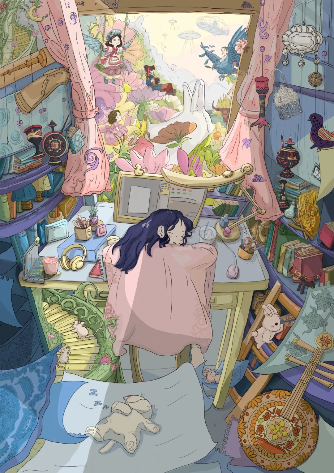 这幅插画以彝族文化与现代设计融合为核心,聚焦热爱彝族文化的设计师女孩。画面以女孩伏案酣睡的卧室为载体,将现实的书桌、耳机等现代物件,与彝族乐器、纹样及奇幻的自然灵物交织,窗外幻化成满是彝族元素的瑰丽梦境。配角小老鼠、猫咪、兔子化身女孩的创作伙伴,既丰富画面层次,又隐喻灵感与文化的陪伴。整体用梦幻的色彩与繁复的细节,诠释女孩在梦境中汲取彝族文化灵感、坚定传承文化的内心世界,让传统与现代在幻想空间里碰撞共生。