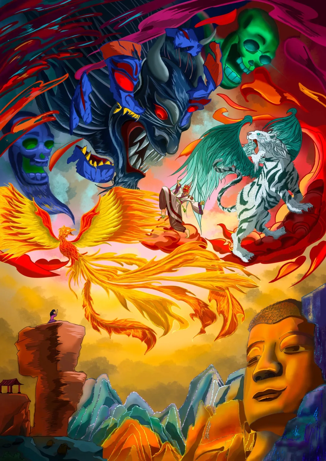 本作品以傩戏驱邪纳吉为核心主题,融合山海经神兽、西南地区当地的特色景观(贵州万峰林、梵净山蘑菇石、乐山大佛)与传统傩戏意象展开创作。画面中,凤凰、穷奇(穷奇虽然是凶兽但是在傩文化中有驱邪和保护百姓的职责)这对瑞兽与凶兽化作傩戏神衹,与狰狞鬼怪形成激烈对抗,暗合傩戏“驱祟逐邪”的仪式内核;佛像的静穆与神兽的动感形成视觉对比,构建出“佛观傩仪”的宏大意境。色彩上以炽烈的红、黄、金与深沉的蓝黑、紫红、青色碰撞,强化驱邪的张力;线条兼具傩面的夸张与传统工笔的细腻,诠释傩文化中祈福安邦的精神内核。
