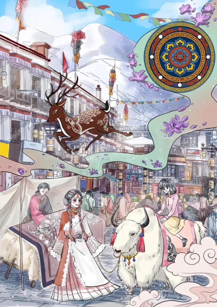 场景是汉族女孩去西藏所涉及到的地方,整副画面主要突出了两个女孩,以及大范围的绘画了西藏文化的各种代表物,如右上角吉祥八宝的纹样,和在半空中的藏鹿九色鹿,在周围有很多藏红花,远处的雪山突出了五彩的经幡,都是藏族文化最传统的元素,在现代社会的街道中添加了很多神话色彩。