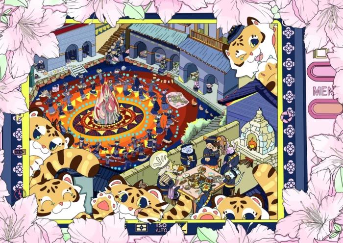 通过卡通美学与民族仪式的并置,以轻松笔触完成了一次对传统文化的当代转换,在索玛花的芬芳与老虎的守护中,讲述了一个关于庆典、共生与永恒天真的故事。