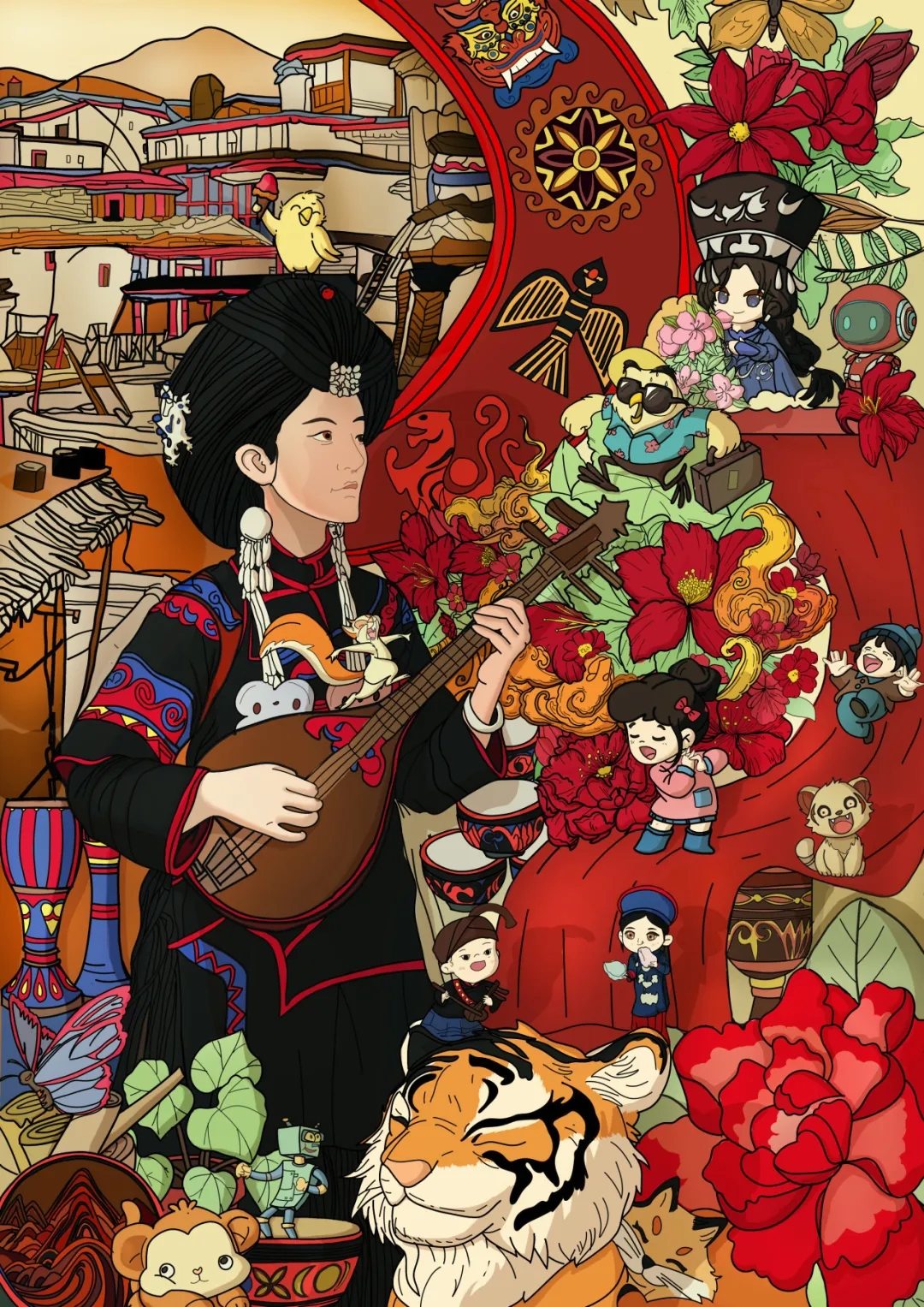 以彝族文化为底,画面核心为穿传统服饰的姑娘弹琴,搭配彝乡村寨、火纹等民族符号。色彩上沿用彝族经典红黑黄三色:黑色稳托服饰基底,红色点亮火纹、繁花与服饰纹样,黄色点缀细节提亮画面,贴合民族审美;加入萌虎、卡通娃、小机器人注入萌趣,让传统色调裹着鲜活感,将彝乡烟火气与音乐味具象为生动画面。