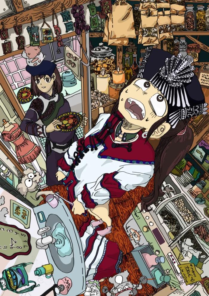 这幅插画以彝族杂货铺的生活瞬间为主题,用彝族少女上学迟到的情节,展现彝族族群的现代生活,打破彝族文化只讲非遗、节庆的刻板印象。前景女儿穿融合彝族服饰元素的衣服,表情夸张、肢体后仰,体现赶时间的慌乱,头饰的彝族银饰花纹也衬出急促情绪;后景母亲是杂货铺老板娘,手持彝族漆器,神态从容,和女儿形成反差,也体现彝族女性的沉稳。背景的杂货铺里,有彝绣、火塘等传统元素,也有现代文具,密集构图还原杂货铺空间感,线条疏密突出人物。