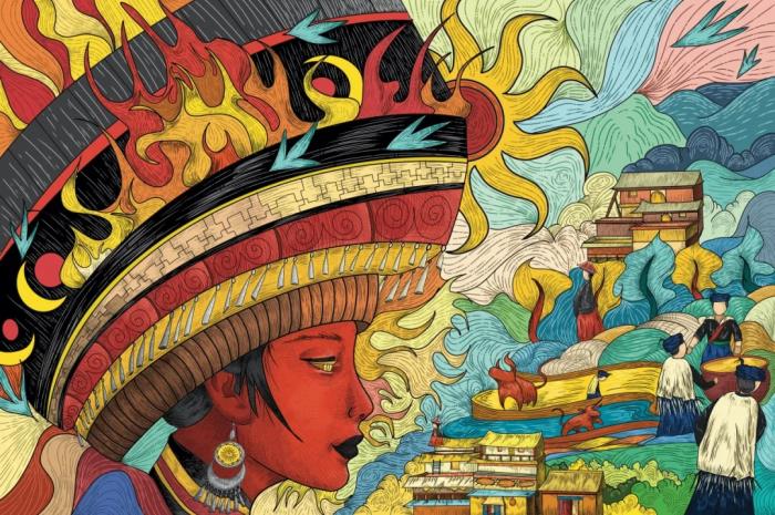 环境意象:背景的山水、云纹采用民族版画式线条,呼应彝族建筑的层叠结构