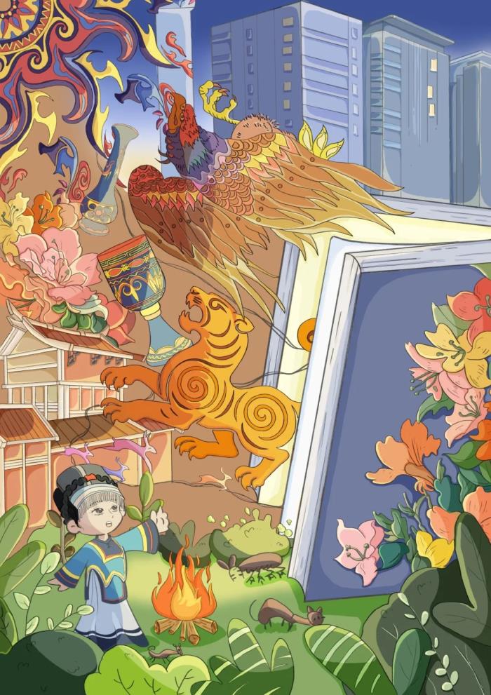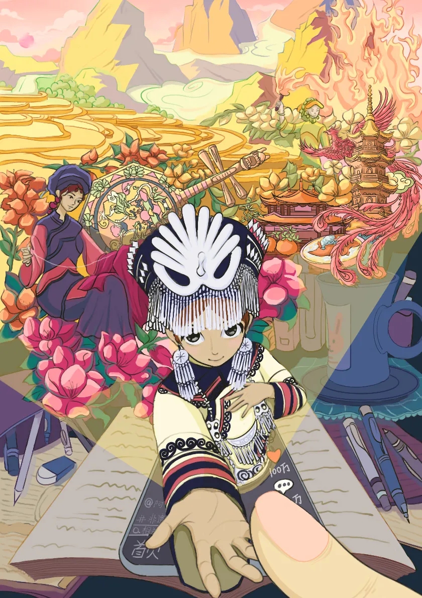 本幅插画以彝族文化传承与现代融合为核心创作主题,将彝族传统元素与现代科技载体结合,展现彝族文化在新时代的鲜活生命力。画面中心的彝族少女身着传统服饰,银饰头饰、刺绣纹样等细节还原彝族服饰的工艺特色,手部伸向观者的动作形成互动感,象征彝族文化主动走向大众的姿态。背景融入彝族梯田、火塘、传统建筑与凤凰图腾,呼应彝族“火文化”与农耕文明;前景的手机投影、书本、文具等现代元素,搭建起传统与现代的连接桥梁,体现文化传承的年轻化与数字化。以暖黄的梯田、热烈的火色、明艳的花簇搭配彝族服饰的藏蓝白色调,既还原彝族传统色彩审美,又通过鲜亮色调营造青春活力的氛围,契合当代审美趋势。