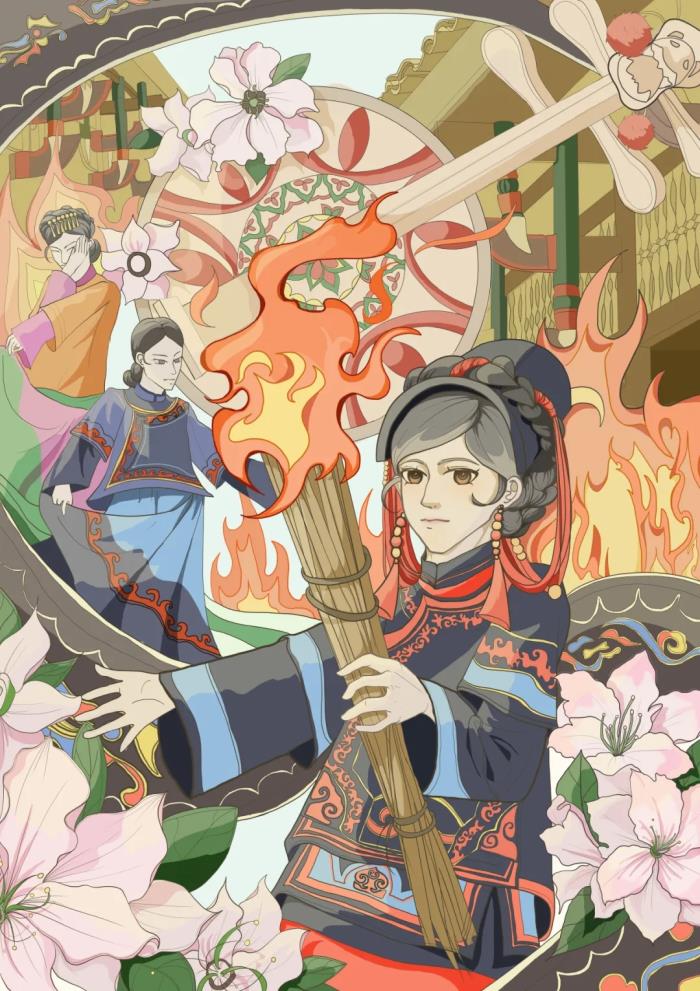 画面以拿火把的小女孩为视觉中心,两名彝族少女身着绣有羊角纹、火焰纹的传统服饰跳彝族传统舞蹈,鲜活呈现节日欢腾。色彩上以橙红暖调凸显火焰热烈,搭配深蓝服饰、深绿青松形成冷暖平衡。构图采用中心辐射式,将彝族服饰、民居、月琴等文化符号融入其中,将索玛花作为装饰,既还原节日盛景,又传递非遗文化的传承魅力。
