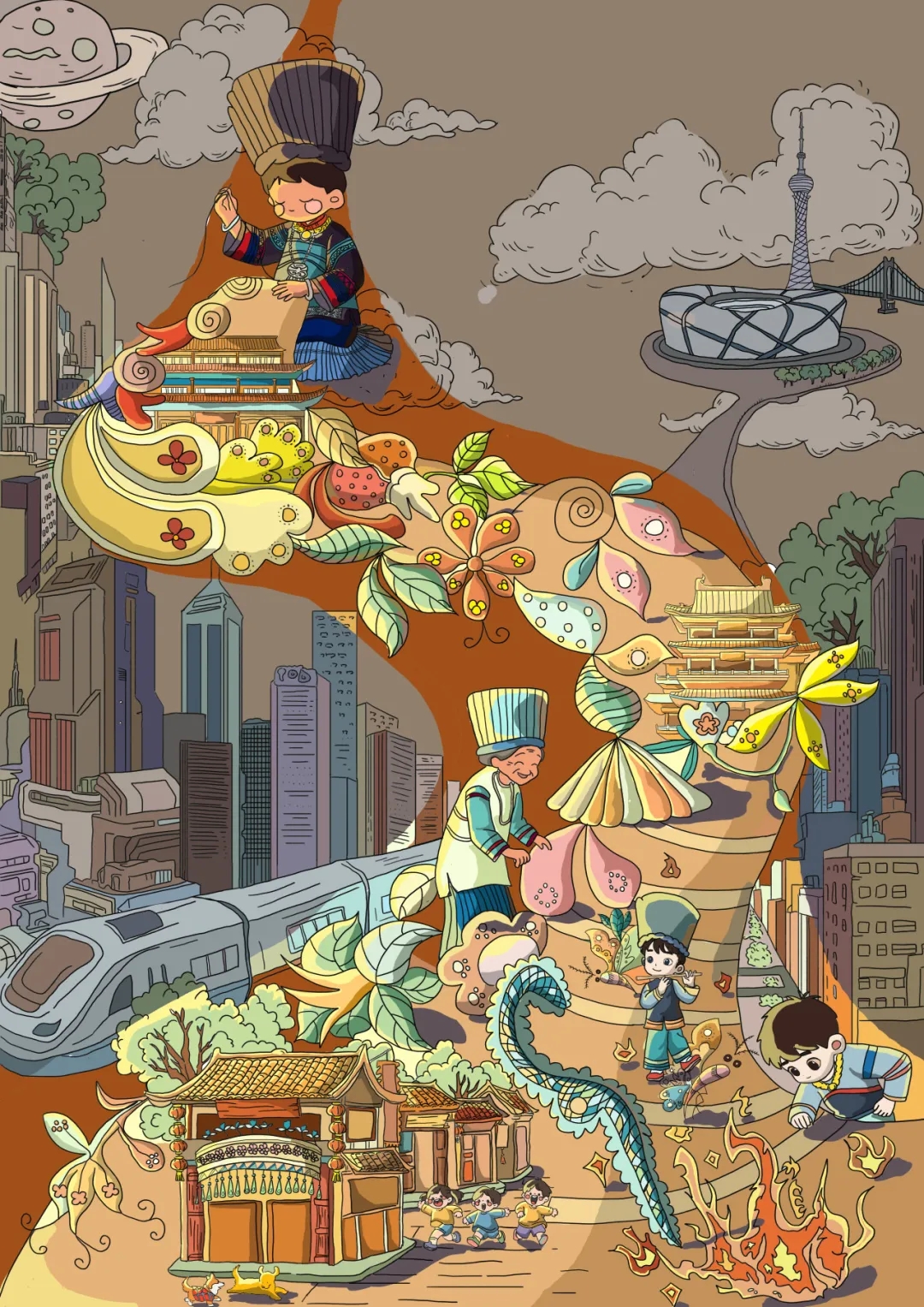 该插画以“彝族文化的古今共生”为核心,通过“纹样从古籍跃入现代城市”的奇幻叙事,将民族风情、神话意象与现代城市景观交织,打造出传统与现代碰撞的视觉叙事。同时展现了民族文化在当代生活中的鲜活传承。