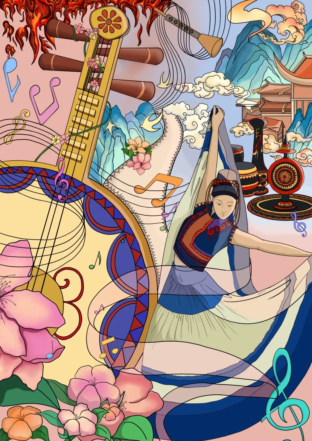 《阿惹妞的弦歌:月琴与彩裙的山风》以彝族乐舞文化为核心,借月琴、阿惹妞舞蹈形象、索玛花等符号,织就彝地风情。月琴为视觉核心,缀以索玛花呼应民族审美;舞者着蓝紫彝装展 “阿细跳月” 韵律,火纹暗合火塘文化,彝山、祥云则铺垫地域底色,音符与花簇串联起乐、舞、自然的共生感。作品以现代国潮手绘风格,用粉、蓝、金等饱和色彩衬出彝族鲜活气质,虚实线条叠加兼顾传统纹样精致与当代审美张力,既凝萃民族文化内核,也以灵动视觉传递 “人与天地共乐” 的生活美学。
