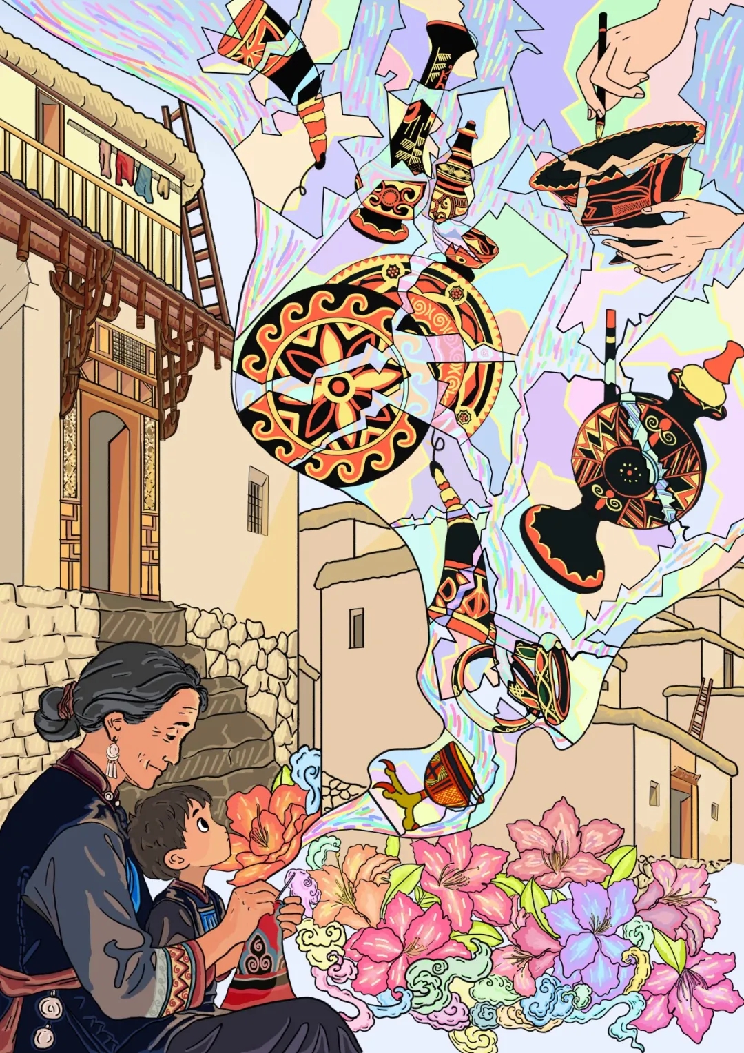 构图上,以写实的彝寨建筑为背景,锚定民族文化的地域根基;前景中奶奶手持彩线教授孩童彝绣的场景,是非遗传承最质朴的具象表达,祖孙间的亲昵互动,传递出传统工艺以“口传心授”方式延续的温暖内核。奶奶指尖的彩线并非单纯的刺绣丝线,而是化作流动的光韵,从针线间蔓延开来,将碎裂的彝族漆器纹样重新拼接、焕活——让“缝补”动作的意象化延伸,也隐喻着传统工艺在当代面临的传承断层困境,以及通过后辈学习、长辈传授的方式,让濒危的非遗技艺重归完整、焕发新生。孩童仰望彩线与漆器纹样的神情,象征着年轻一代对民族文化的好奇与接纳,成为传承链条中最具生命力的一环。整体画面以“具象场景+抽象意象”的结合,将“保护非遗、延续根脉”的主旨具象化,在视觉体验中感知民族传统工艺的珍贵,以及传承的意义与力量。