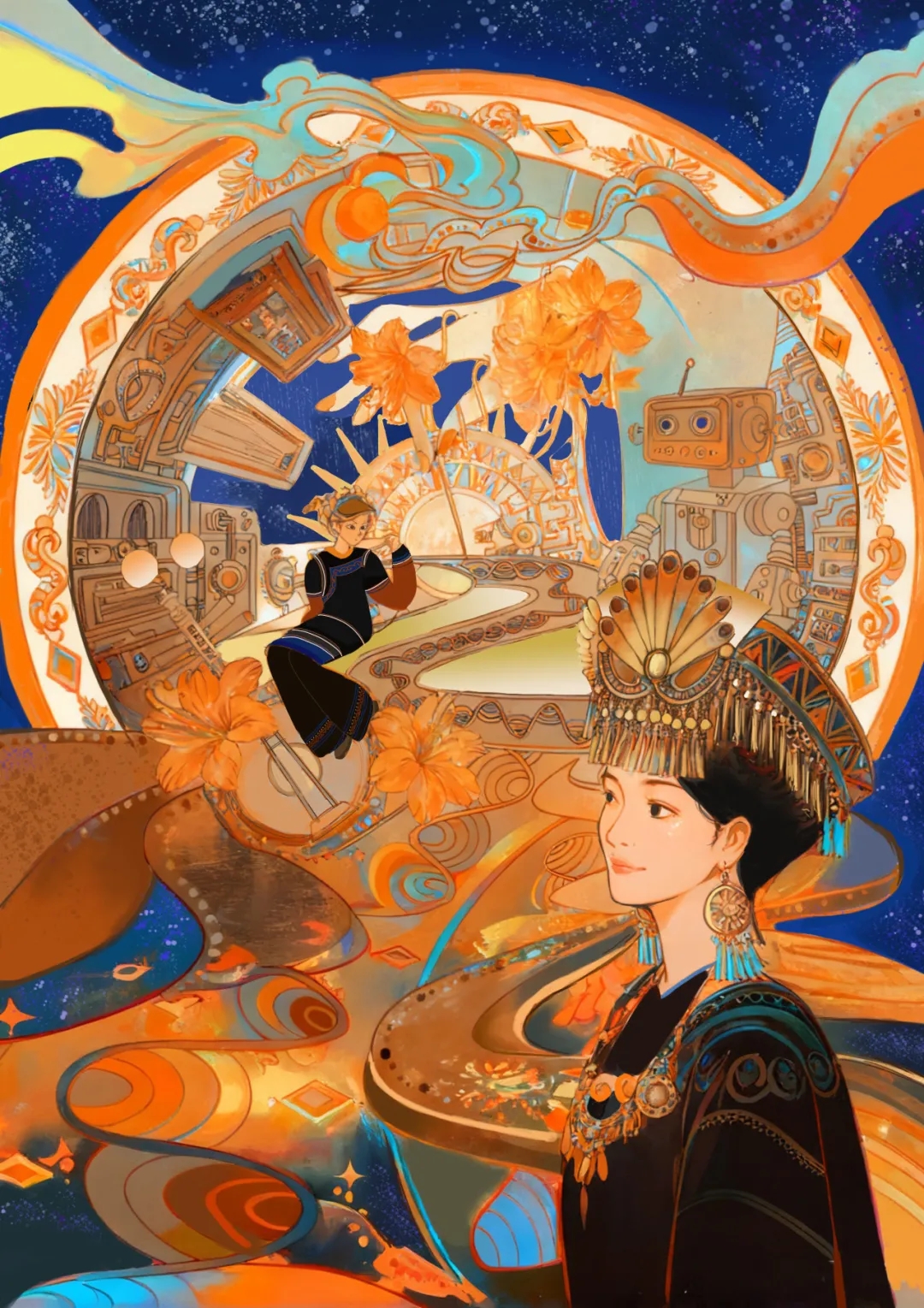 画面中,阿依身着标志性的彝族黑底刺绣服饰、头戴银饰头饰,既是文化的“承载者”;而背景里未来感的机械装置、悬浮空间,则是“异世”缩影二者以柔和的橙蓝渐变色彩衔接,既体现传统与未来的碰撞,也暗喻文化传承的时空联结。