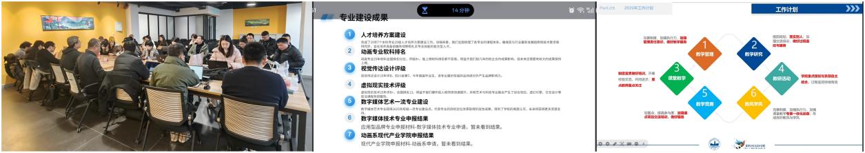 刘移民副院长就动画系及分管学科与专业建设中心工作进行总结汇报。2025年学院在专业建设、课程建设、教材建设等工作方面均取得系列成果,组织了大分层课程组建设与AI智慧课堂改革,完成127项课程思政案例设计,并落地4门校企合作课程资源。动画系完成专业评估升级,积极申报顶尖产业学院,在教研项目与教学奖项上取得突破。但当前仍面临专业特色不够鲜明、课程思政融合深度不足、校企合作质量与成果转化机制有待优化等挑战。下一步将围绕深化专业调研、优化课程体系、强化课程思政融合、提升校企合作实效等重点方向持续发展。